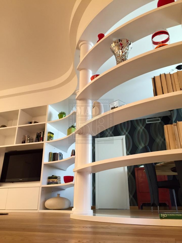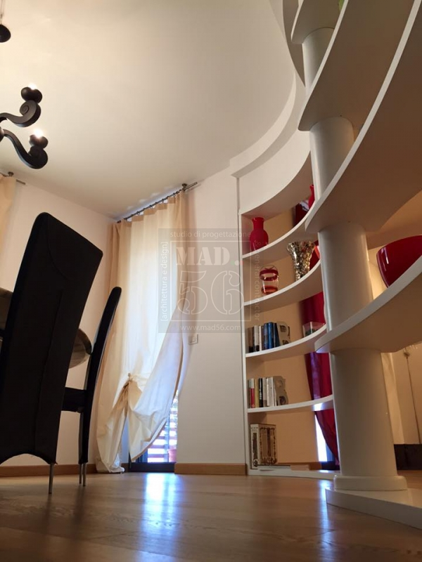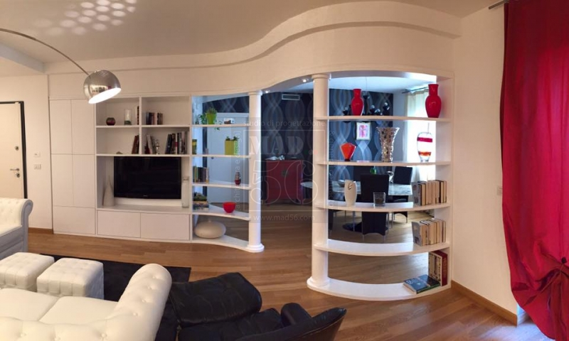 Ristrutturazione di un ambiente interno con controsoffittature, carta da parati, tendaggi, illuminazione teatrale, arredi di pregio e una libreria completamente realizzata su misura, trasformano l'area giorno in un ambiente suggestivo e di lusso.