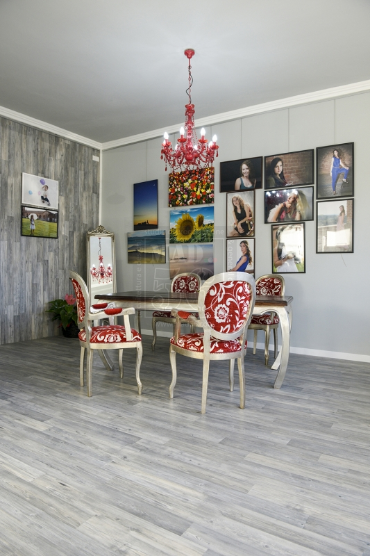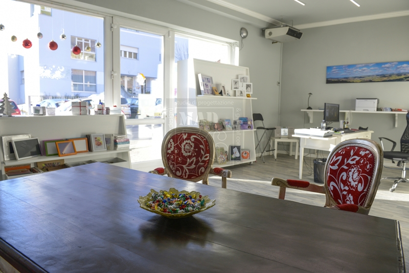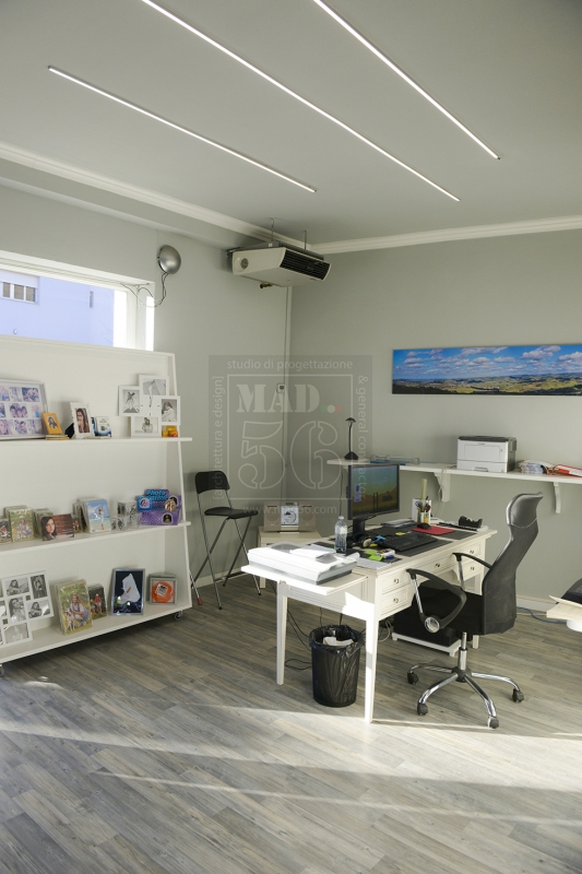 Restyling completo di un negozio di fotografia con tonalità fredde del grigio e del bianco e accenni di tonalità calde del rosso. L'ambiente è un giusto mix di stile classico e moderno.